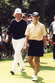 ![]() Kompisarna Helene Alfredsson och Annika Sörenstam möts för fjärde gången den här veckan. Nu är det inte puss och kram och roliga historier som gäller utan segern i Compaq Open. Foto:Leopold Report ![]() |