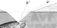 FISKENS FÖNSTER Hur ser man i fiskperspektiv? En intressant fråga för dig som fiskar, eller hur? Du har säkert märkt att vattnet och ljuset spelar en del spratt för det mänskliga ögat. Vi tror t ex att fisken under vattnet är närmare än den är där vi står på stranden eller bryggan. Hur ser då fisken från sitt håll? ![]() På bilden ser du fiskens synfält rakt ovanför. Genom "fönstret" ser fisken en sammantryckt bild av allt ovanför vattenytan - med undantag för sådana föremål som ligger nära vattenytan. ![]() Utanför "fönstret" fungerar vattnet som en spegel - fisken ser både den verkliga flugan och dess spegelbild. Ibland hugger den "fel" fluga - försök igen! EN RIKTIG SPÅRHUND Fisken har ett väl utvecklat luktsinne. Med det kan fisken hålla sig informerad om var fientliga arter håller till. Eller om det finns några från den egna arten i närheten. Och om det plötsligt dyker upp någon doft i vattnet som inte hör hemma där. Avgaser från en båtsnurra, kaffesump eller liknande. Se därför till att drag, linor etc inte läggs bredvid reservdunken i bakluckan t ex. |