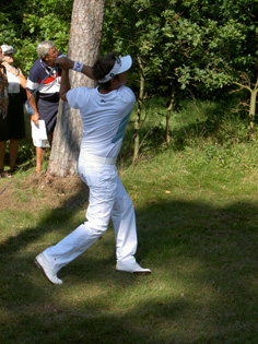 En perfekt drive som landade mitt på fairway. Ovationer! Men härifrån