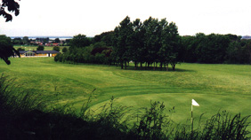 Hål nr 1 på S:t Ibb på Ven med klubbhuset i bakgrunden.