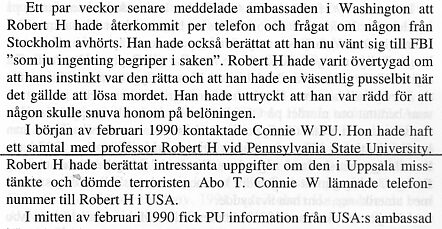 well as the CIA. The Swedish Foreign Ministry, the Swedish Security Police (SÄPO), and the FBI were all behind the information to PU that "nothing was known about William Herrmann". However, it turned out that Professor Harkavy knew about him. In March, 1993, according to GK, he told PU that Herrmann was willing to come to Sweden to provide more information. Thus, Harkavy revealed that he knew Herrmann, that he knew Herrmann was one of PU's sources, and that he acted as Herrmann's messenger. Hence, this pair is tied together. In light of this, it is interesting that both had extensive networks in Sweden: Arms dealer William Herrmann had visited Sweden several times from the early 80's until the disclosure of the Bofors scandal in 1985. Later, he also was in Sweden at a number of occasions in connection with the Palme investigation, and in connection with his own contacts in the arms industry (Bofors and the Swedish arms dealer Sven Klang). The Bofors scandal was about illegal exports of Swedish arms and ammunition to countries at war or in warlike situations. It was discontinued after Prime Minister Palme became aware of it in 1985 - six months before he was murdered. Harkavy had spent much time in Sweden from 1985 to 1993. His extensive network in Sweden was more or less described by GK. Already in 1985, he worked at the SIPRI peace research institute, and established a relationship with Emma Rotschild, who had a personal relationship to Palme. After the 1986 Palme murder, he was in contact with Ebbe Carlsson. He even tried to get in touch with Palme's widow Lisbeth and his son Mårten via Emma Rotschild. Further, Harkavy made contact with Ambassador Hans Dahlgren at the Prime Minister's Office (GK p. 508). Harkavy said that he also had received information from Bernt Carlsson, one of the Palmes closest advisers (GK p. 508). Harkavy was so well known in Sweden that he gave lectures at SIPRI and the Swedish Foreign Policy Institute several times in the period 1991-1992. Palme's relationship to Emma Rotschild must have caused a lot of attention