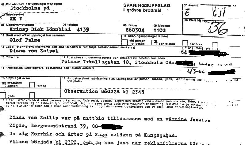 början blev inte trodda av chefsåklagare KG Svensson. Och det var kanske inte mycket att säga om - tre stycken ur personalen förnekade att det kommit in någon på biografen efter föreställningens början. Men de ljög. En grupp inom våldsroteln vägrade tro att flickorna diktat upp historien. Jessica var bartender på en av Stockholms innekrogar och van att iaktta folk Både hon och Diana betraktades av utredarna som mycket trovärdiga. Ur Jessicas vittnesmål: Föreställningen Morrhår och ärtor på Saga började 23.00. Cirka 45 minuter in på föreställningen så öppnas plötsligt den dörr till salongen som är belägen cirka 8 meter snett bakom damernas platser. Dörren öppnas inte på vid gavel och JS får uppfattningen att det mera verkar som personen inte vill störa föreställningen. Dörren öppnas ungefär en kroppsbredd. Vad JS la märke till var den snabbhet mannen efter det han kommit in i salongen visade när han var på väg till den plats han satte sig på. Han mer eller mindre halvsprang, dock tyst, och han tog plats i en bänkrad tre rader framför damerna och ingen annan person satt intill honom. Kommen in i bänkraden så sjönk mannen djupt ner i biograffåtöljen och endast huvudet var synligt bakifrån. Här satt mannen blick stilla till dess föreställningen var slut omkring 00.40. Vid utgåendet hade damerna ingen större brådska, gick nog bland den senare halvan av publiken. Den omtalade mannen gjorde sig inte någon särskild brådska utan lämnade lokalen lugn och sansat. JS beskriver mannen: ca 180 cm lång, mörkt hår, dock inte kolsvart, ovalt ansikte möjligen något åt det smalare hållet, påfallande stor rak näsa. Han var normalt klippt, inget hår växte över kragen. Klädsel: Antingen svart eller mycket mörkbrun överrock, knälång, det sistnämnda är hon säker på. Övrig klädsel har JS endast intrycket av att den var mörk. Hon tror att mannen var barhuvad, hade han någon huvudbonad så var det i alla fall en mindre sådan, även denna mörk." Flickorna pressades hårt på tidpunkten men kunde med ledning av filmens innehålla träffa rätt med ungefär fem minuters marginal. I stort sett halva filmen hade gått när mannen kom in. Det rör sig om ungefär 20 minuter efter mordet. Men det var flickornas version. De båda biografvaktmästarna och kassörskan förklarade att ingen kommit in efter föreställningens början. Vaktmästare BS påstod att han var kvar på sin arbetsplats till 01.00. Endast en dörr var öppen och ingen hade kunnat ta sig in utan att upptäckas. Flickorna blev inte trodda på sina vittnemål. I en intervju i Expressen några veckor senare kom det fram uppgifter från personalen att det verkligen kommit in en man på biografen vid den tidpunkt som flickorna uppgett. Vi nya förhör framgick det att det ofta förekom vindrickande i källaren, att de inte höll så noga på arbetstiderna etc. De hade skyddat varandra men förstod nu att det varit dumt. En vaktmästaren fick ett anonymt hotsamtal där han uppmanades att hålla tyst om vad han sett. Allt detta ledde till att ingen vågade lämna något signalement på mannen.Ur förhöret: F (förhörsledaren):-Då måste du ju veta någonting om hur människan såg ut? BS:-Nej. F:-Hur han var klädd? BS:-Jag vet inte. Man tänker inte på sådant. F:-Bar han på någonting? BS:-Nej, det gjorde han inte. F:-Hade han någonting på huvudet? BS:-Nej, det tror jag inte han hade. F:-Vad hade han för kläder i övrigt då? BS:-Det vet jag inte. Personalen bidrog inte med en enda uppgift till ett signalement på mannen. De uppgav att han hade hållit sig i mörket och medan kassörskan återvände med en biljett hade han rusat ner på totaletten. Han betalade och tog sig själv in genom dörren. Flickorna konfronterades med Gunnarsson. Diana är osäker men har honom med bland de hon kan tänka sig. Då han i spegeln går rakt mot Jessica med knuten näve får hon ett sammanbrott. Inte förrän man visat henne att personen på andra sidan inte kan se vittnet lugnar hon sig. Konfrontationen blir misslyckad. De får se 7 foton på rockar varav Gunnarssons är en. Rocken finns med bland de som kan tänkas. Plötsligt kommer en av poliserna in med Gunnarssons rock på sig. Då konstaterar båda två spontant att det måste vara samma rock. Åter till sammandraget Åter till artikel ![]() |